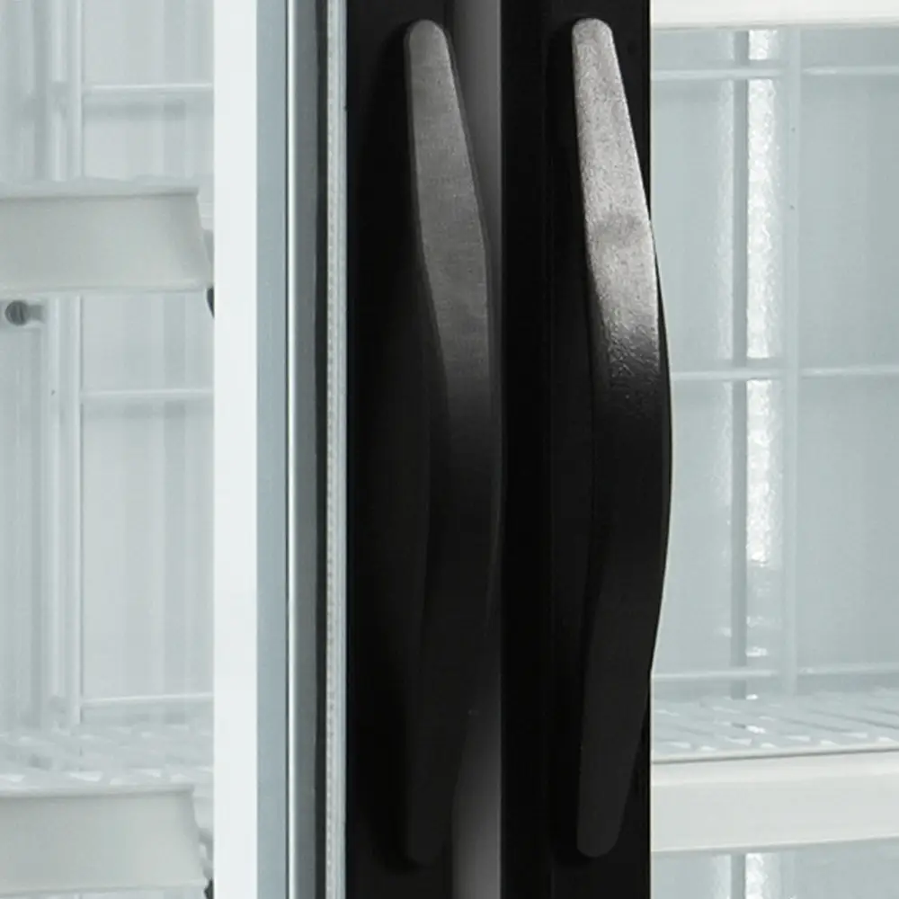 - Self-closing hinged glass doors