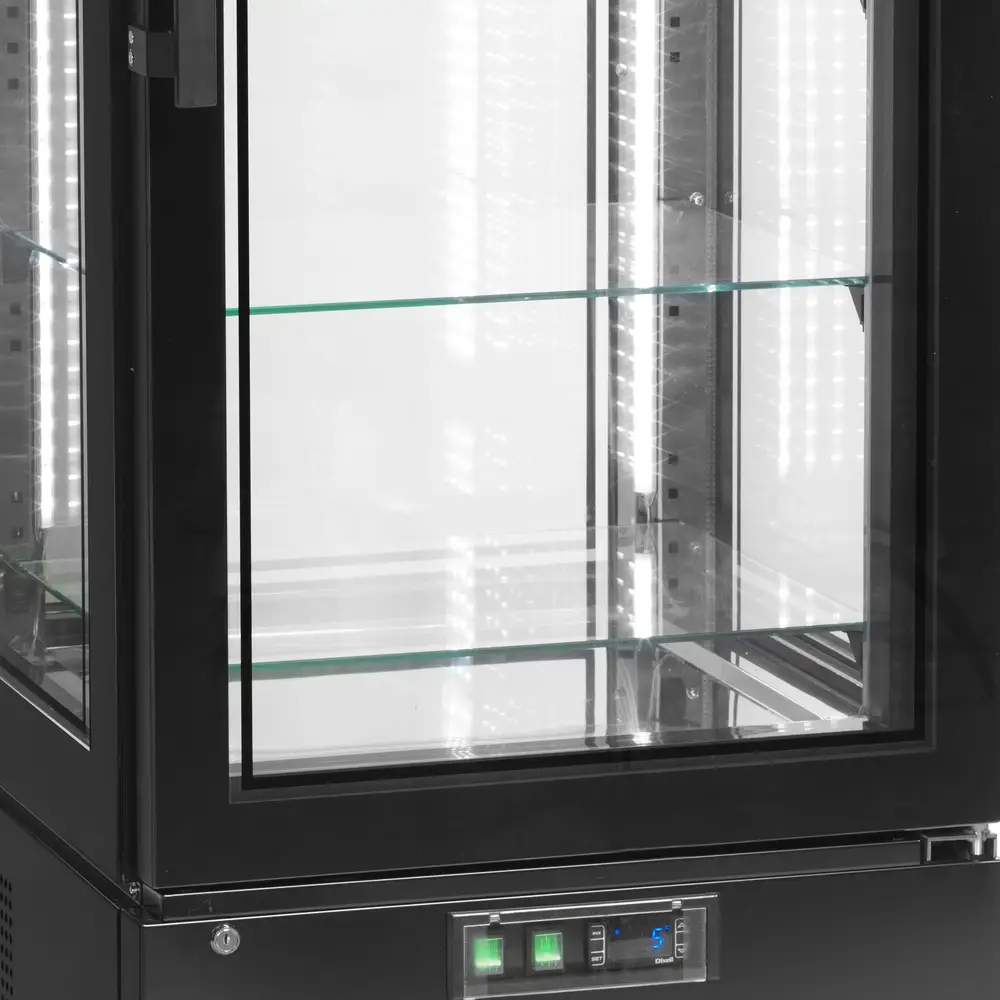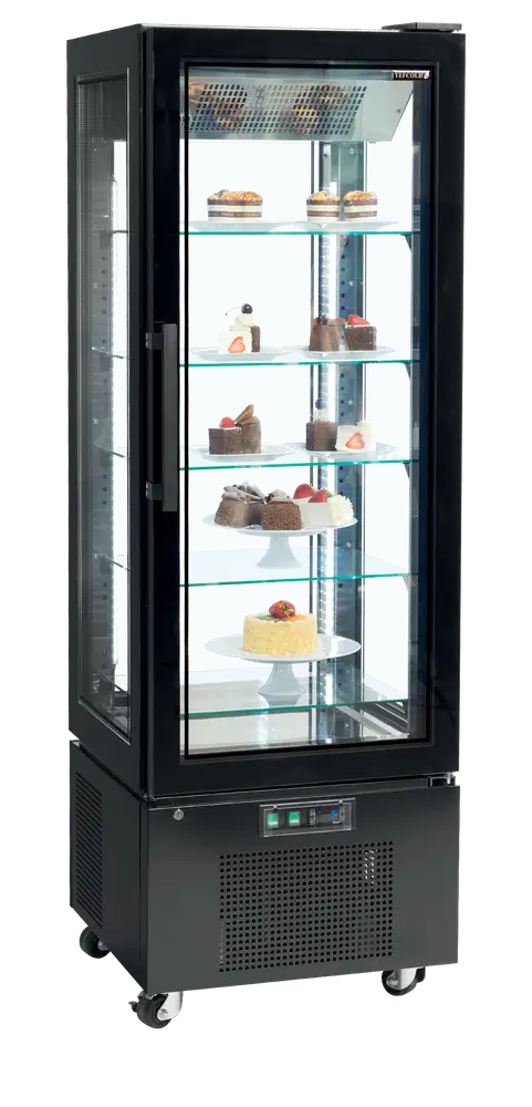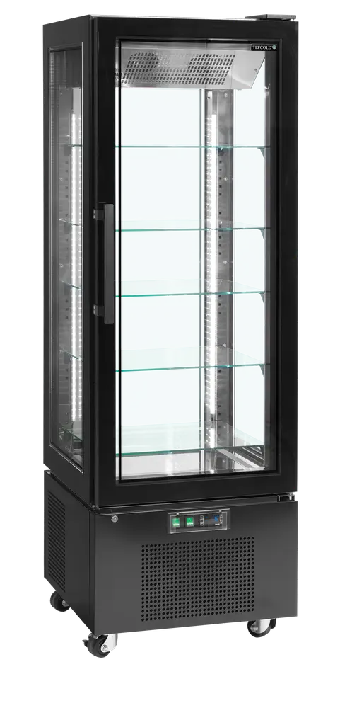 The UPD400C showcases products with double-glazed glass on all sides and a frameless door. Ideal for cakes and desserts, with optional wine shelves. It features a black steel exterior and a stainless steel interior with a mirror effect. Vertical LED lights and five adjustable glass shelves add versatility. The digital display controls ventilated cooling, with settings to prevent pastries from drying out. Mounted on castors for easy movement, it also comes in a freezer version.