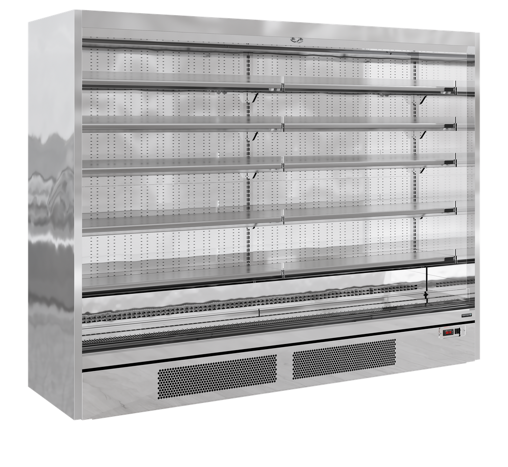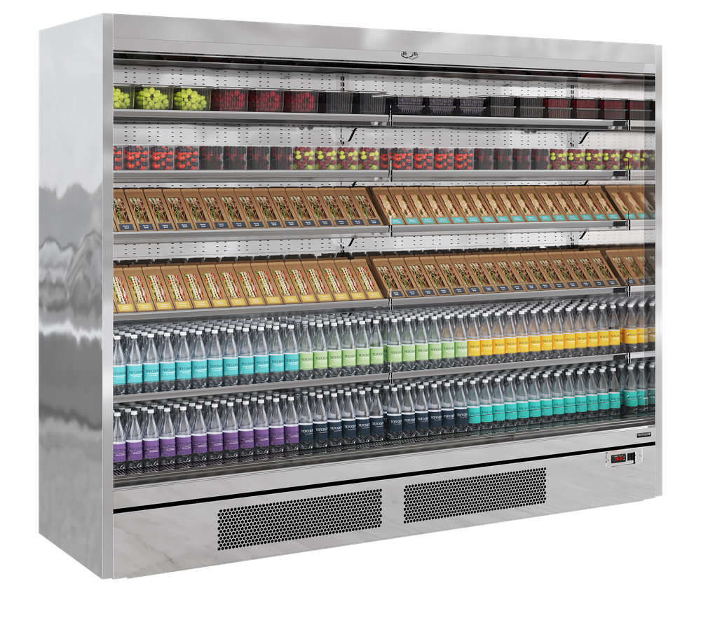 The TEFCOLD Galaxy+ range, finished in mirror stainless steel: our latest innovation in plug-in multidecks. We’ve combined an expanded display area and optimised cabinet efficiency. The ultra-low front and slim top canopy provide an extra 100mm of internal height, accommodating up to 5 shelves (plus base) as standard, all while maintaining an overall height of just 2040mm. With a depth of only 740mm, the unit fits through standard doors for easy installation, yet has 400mm deep shelves for maximum stock capacity. Each unit comes with heavy-duty adjustable shelves that can be tilted if needed, as well as EPOS ticket strips and shelf risers as standard. Optional extras include glass end-walls and multiplexing kits.