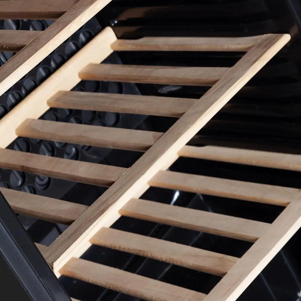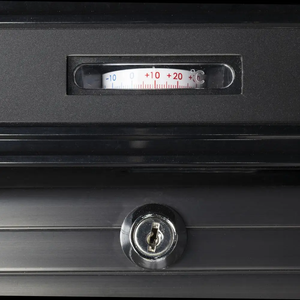 This is a version of the best selling SC381 finished in stylish black, inside and out and is supplied with 6 adjustable wooden shelves for the display and storage of up to 78 wine bottles. It has fan assisted cooling and comes with a temperature display, There is a vertical LED light inside and a lock fitted as standard.