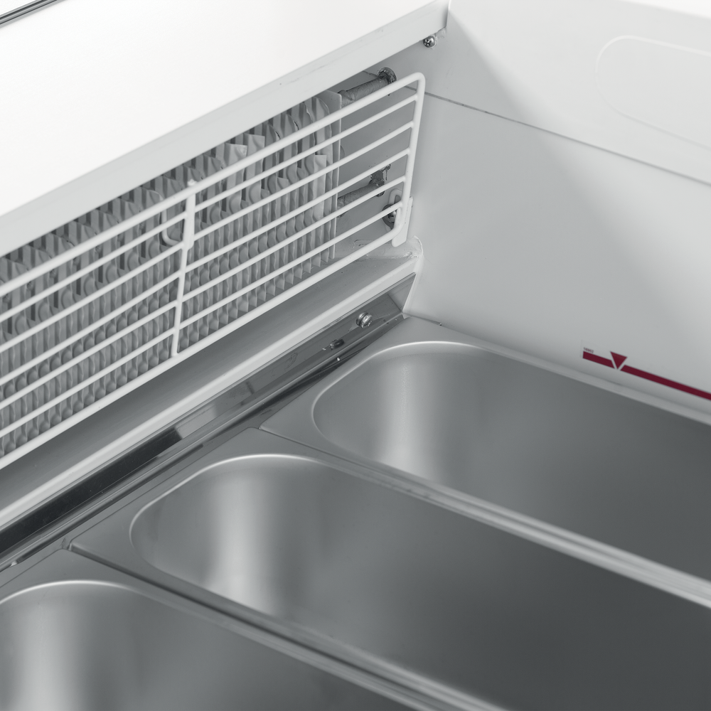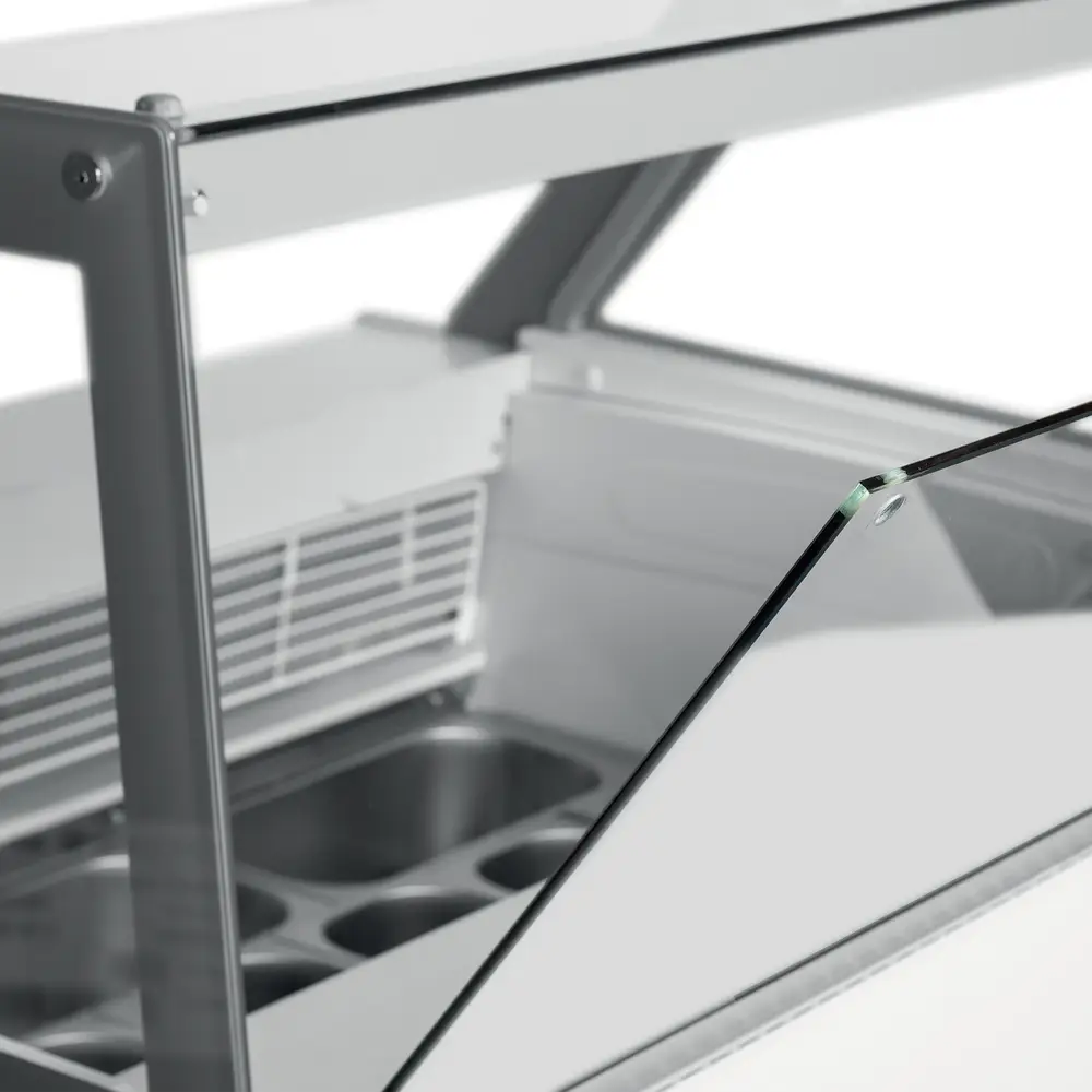 Introducing the Elegance, a quality static cooled ice cream scooping display. With its contemporary flat glass design, this stylish cabinet adds a touch of elegance to any ice cream parlor, café, or shop. The unit comes in either 10 or 13 scoop options to showcase a tempting variety of flavours. It has an equivalent number of pans under the main display for tempering, and more in the frozen under storage accessed from the rear door. Ideal for branding.