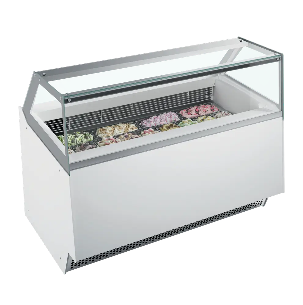 Introducing the Elegance, a quality static cooled ice cream scooping display. With its contemporary flat glass design, this stylish cabinet adds a touch of elegance to any ice cream parlor, café, or shop. The unit comes in either 10 or 13 scoop options to showcase a tempting variety of flavours. It has an equivalent number of pans under the main display for tempering, and more in the frozen under storage accessed from the rear door. Ideal for branding.