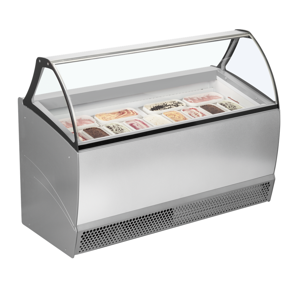 The Bermuda range is available in two display sizes, either 10 or 13 pans. The cabinet is equipped with a ventilated cooling system that ensures your ice cream or gelato is kept at at the ideal serving temperature. Additionally, the Bermuda unit features separate refrigerated under storage, allowing for efficient restocking of the display without having to leave the cabinet. The Bermuda’s sleek curved glass design is both elegant and practical, featuring a heated surface to prevent condensation. It comes as standard with castors for easy mobility, and an internal LED light that beautifully illuminates your products. With its attractive combination of quality and affordability, the Bermuda range is a popular choice for ice cream and gelato sellers.