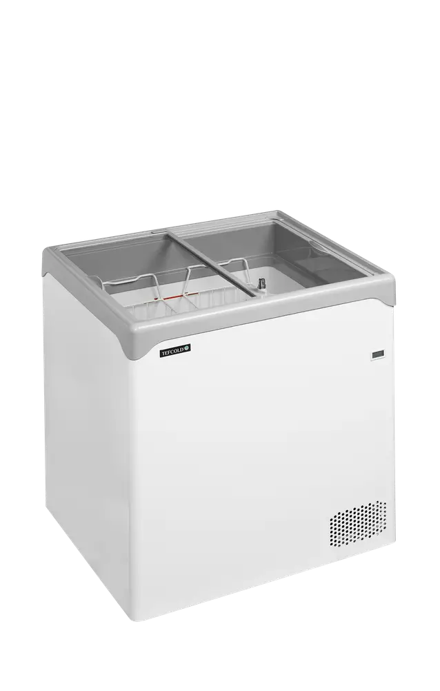 The NIC-SC range is a compact display chest freezer in an elegant design. It has curved corners, rounded edges and flat sliding glass lids.