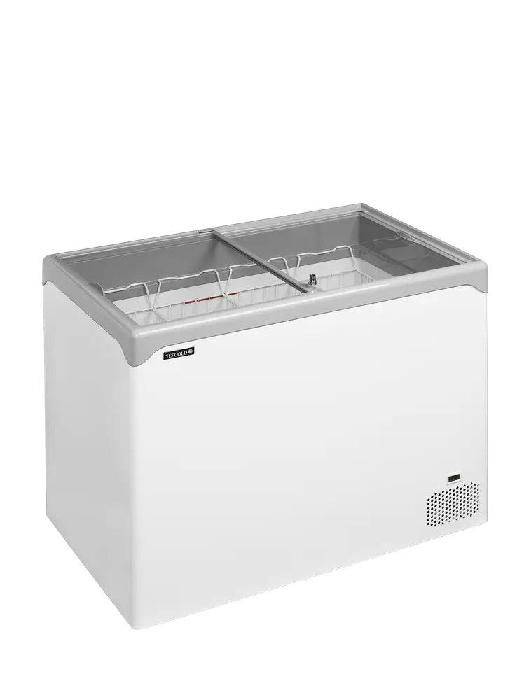 Elegant chest freezer with flat sliding glass lids