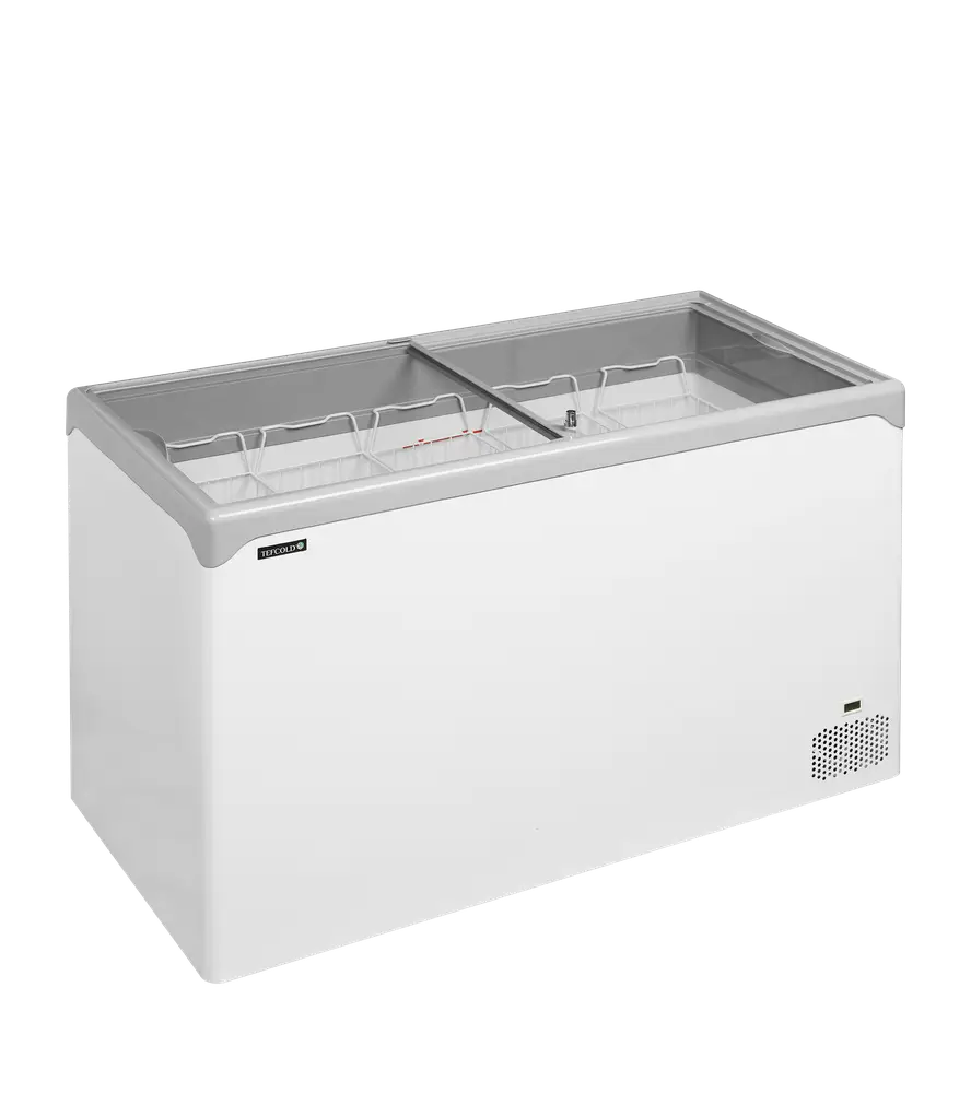 The NIC-SC range is a compact display chest freezer in an elegant design. It has curved corners, rounded edges and flat sliding glass lids.