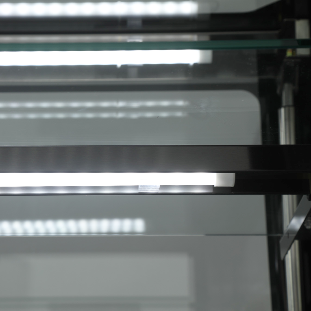 The PDA3-CTF range of chilled display counters has a flat glass structure, where the front hinges forward for easy cleaning. This premium design is made with high quality materials and comes in several sizes. It offers features such as glass shelves with LED lighting underneath, anti-mist front glass, and an efficient ventilated cooling system.