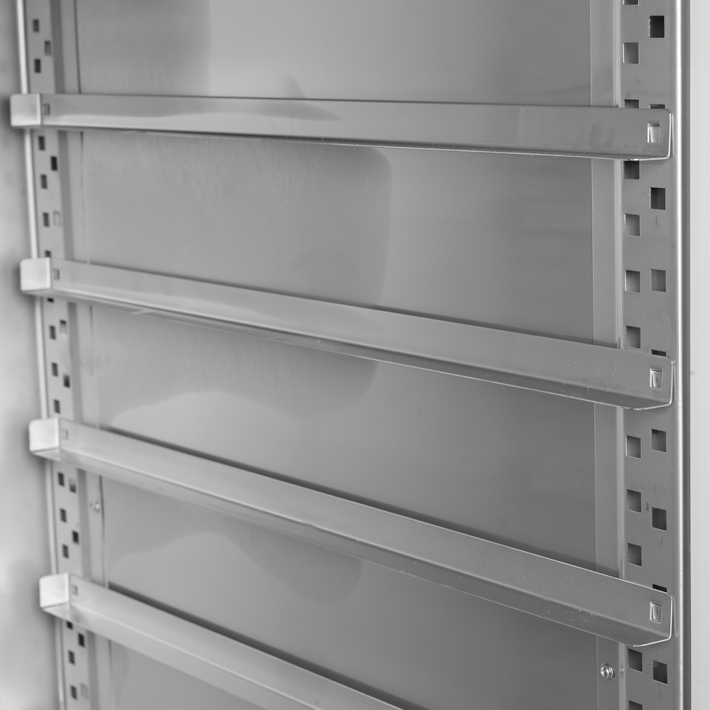The BF850I freezer is optimised for both bakeries and for ice cream storage. It has euronorm dimensions with guides for bakery trays. In addition, it comes with shelves, accommodating up to 54 Napoli pans (not included). A ventilated cooling system makes sure your ingredients stay fresh. The temperature of the unit is easily controlled by a digital thermostat.
