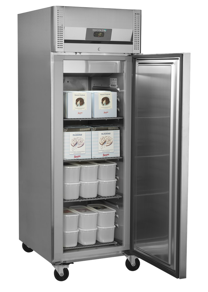 The RF-X GN dimension range of upright freezers with 1 or 2 solid doors is created for professional kitchens and have adjustable shelves in GN2/1 dimensions. It is made from high quality catering grade SS304 stainless steel and has strong wheels for mobility. Ventilated cooling ensures an optimal temperature, which can be set on a digital thermostat – complete with Bluetooth for easy monitoring via an app. We also have a RF range for smaller spaces, but this does not have GN dimensions.
